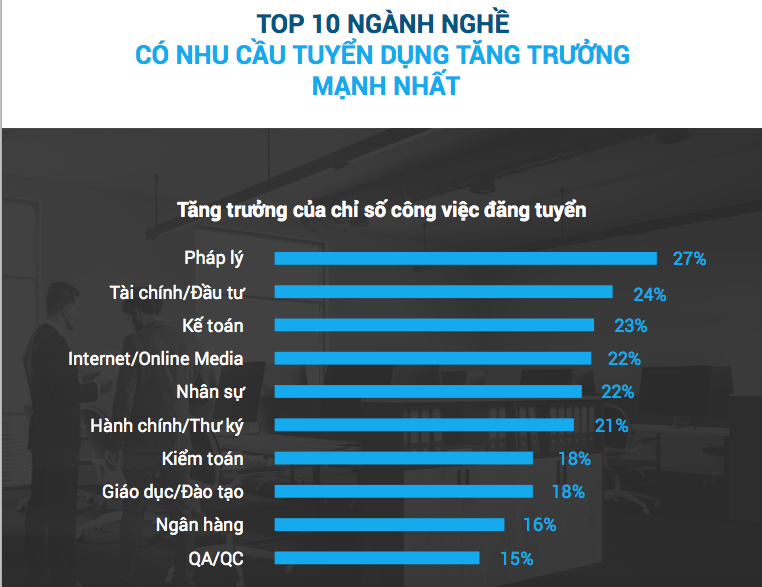 Ngược lại, top 10 ngành nghề có nhu cầu tuyển dụng cao nhất lần lượt là: Bán hàng, Tài chính/ Đầu tư, Hành chính/ Thư ký, IT - Phần mềm, Marketing, Kế toán, Chăm sóc khách hàng, Internet/ Online Media, Xây dựng, IT - Phần cứng/ Mạng.
