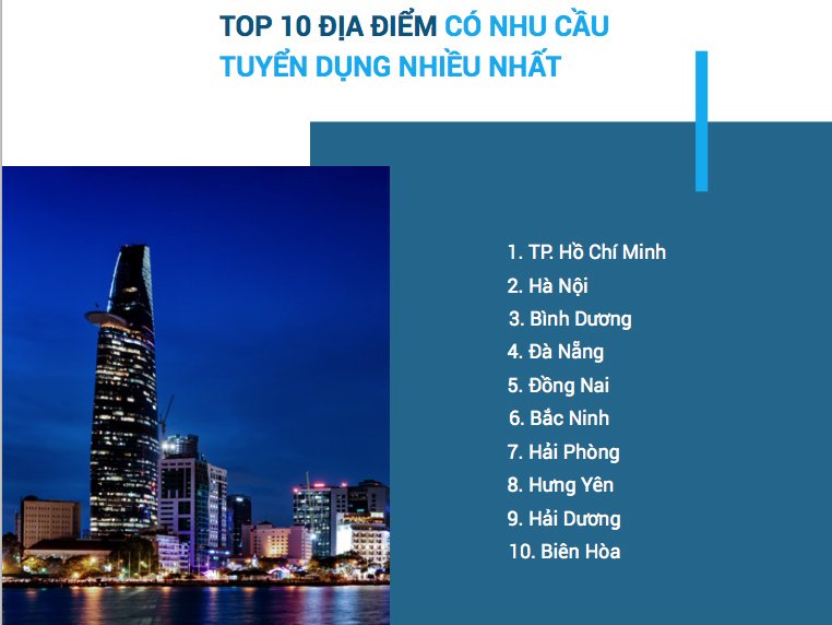 Trong danh sách top 10 địa điểm có nhu cầu tuyển dụng nhiều nhất, TP.Hồ Chí Minh vẫn duy trì vị trí đứng đầu cả nước về nhu cầu tuyển dụng nhiều nhất và nhu cầu tuyển dụng tăng trưởng mạnh nhất dựa trên chỉ số công việc đăng tuyển với 15%. Đáng chú ý, mặc dù Hà nội đứng thứ 2 về nhu cầu tuyển dụng nhiều nhất trong năm 2018, nhưng chỉ đứng thứ 8 với 3% tăng trưởng.