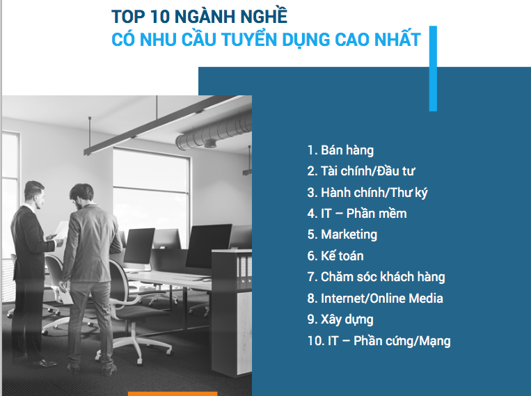 Theo dự báo của VietnamWorks, danh sách top 10 những ngành nghề có nhu cầu tuyển dụng cao nhất năm 2019 bao gồm: Tài chính/Đầu tư - Bán hàng - Hành chính/Thư ký - Kế toán - IT/Phần mềm - Marketing - Chăm sóc Khách hàng - Kiểm toán - Internet/Online Media và Xây dựng.