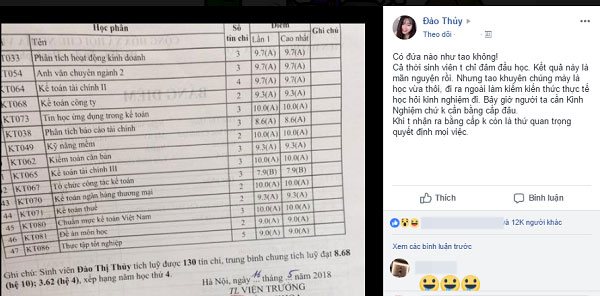 Chỉ sau vài giờ đăng tải, bài viết của cô nàng nhanh chóng thu hút hơn 12.000 lượt thích và hàng nghìn bình luận. Mặc dù đạt kết quả học tập tốt và cầm tấm bằng loại xuất sắc trên tay nhưng cô bạn lại tiếc nuối vì 4 năm học Đại học không chú ý tích lũy thật nhiều kinh nghiệm thực hành từ thực tế cho bản thân. “Đúng là bằng cấp không phải thứ quan trọng quyết định mọi việc. Bản thân mình đã từng rơi vào trường hợp như thế khi đi tìm việc làm thêm. Hầu hết các tin tuyển dụng đều yêu cầu kinh nghiệm làm việc và bằng cấp chỉ cần từ trung cấp hoặc cao đẳng trở lên đối với một số công ty. Vì ít kinh nghiệm nên có lần mình đi xin việc mà không được”.