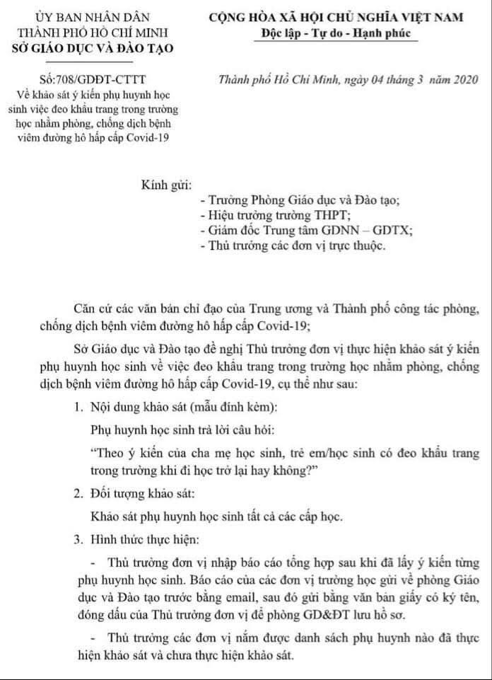 Theo đó, căn cứ vào các văn bản chỉ đạo của Trung Ương và Thành phố về công tác phòng chống dịch bệnh viêm đường hô hấp cấp COVID-19, Sở GD-ĐT TP.HCM mới đây đã đề nghị khảo sát yêu cầu của phụ huynh về việc đeo khẩu trang trong môi trường học đường.
