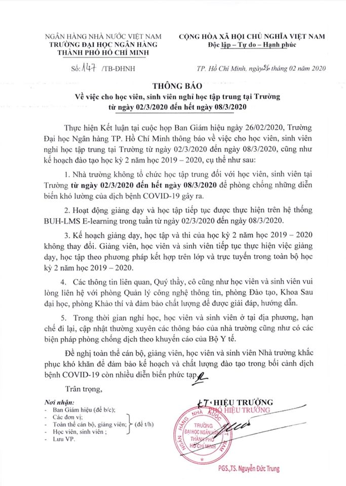 Thông báo về việc tiếp tục cho học viên, sinh viên nghỉ của trường ĐH Ngân hàng TP.HCM