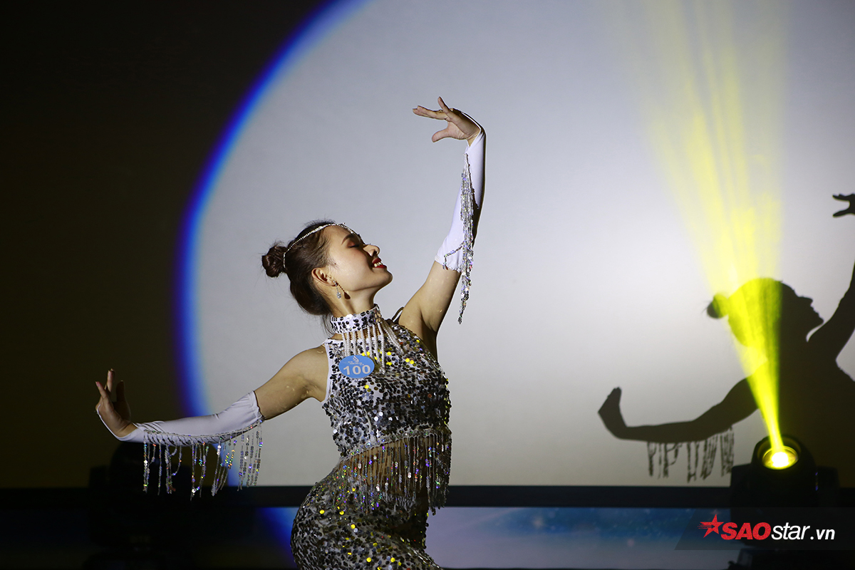 Hoàng Trung Thu - khoa Ngoại ngữ uyển chuyển khi thể hiện điệu múa Ngắm mình dưới trăng