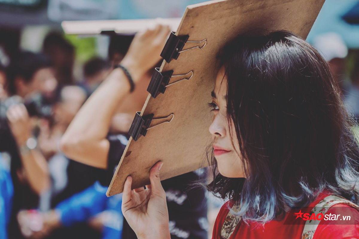 Bên cạnh sự hào hứng thì một số bạn có vẻ hơi nặng nề với bảng vẽ bằng gỗ bên tay, tay kia thì mang một túi đựng nào là màu nước, bút chì, bút lông, thước, compa…
