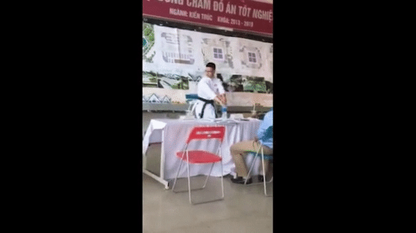 Theo đó, nam sinh viên này chọn đề tài thiết kế một trung tâm võ thuật, trước khi vào nội dung chính, nam sinh này đã biểu diễn một bài quyền Karate khiến cho các thầy giáo trong hội đồng bảo vệ và các sinh viên phía dưới vỗ tay không ngớt bởi quá sáng tạo.