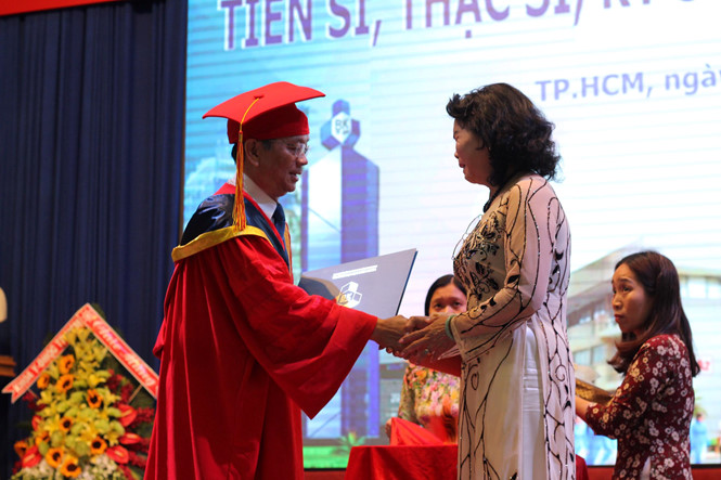 Buổi lễ đã xuất hiện hình ảnh xúc động về người mẹ nhận bằng thạc sĩ danh dự ngành quản trị kinh doanh thay con gái Nguyễn Thị Phương Linh đã mất vì tai nạn giao thông.