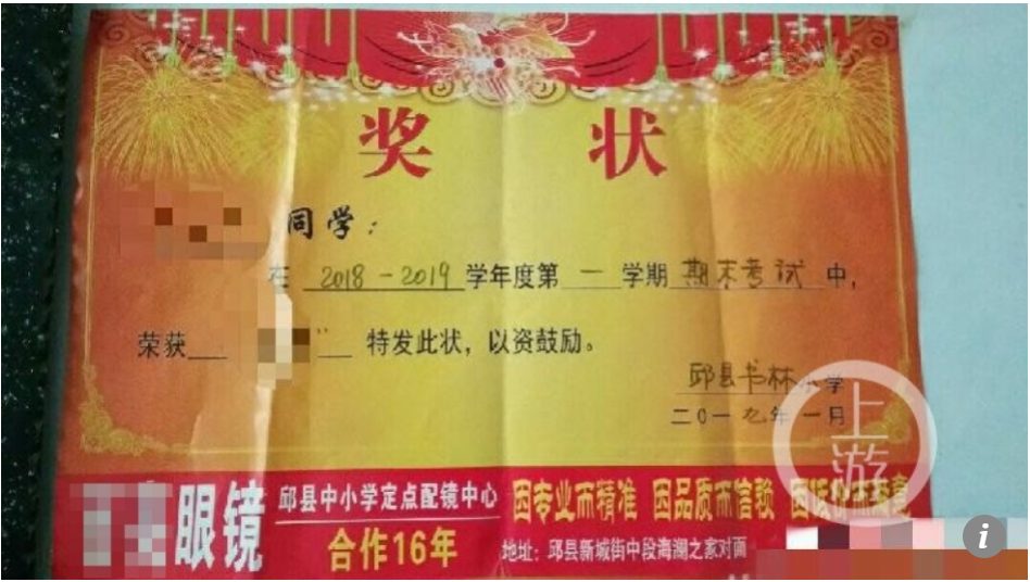 Trước đó, ngôi trường này đã trao giấy khen cho những người có thành tích cao nhất trong kỳ thi cuối kỳ đầu tiên năm học 2018-2019. Tấm giấy khen có dán logo màu đỏ ở phía dưới với tên và địa chỉ của một cửa hàng kính mắt được cho là của nhà cung cấp kính cho học sinh trường tiểu học và THCS trên địa bàn Hàm Đan suốt 16 năm qua.