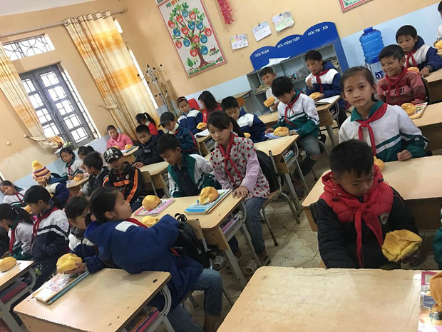Sáng nay tôi đã đặt hiệu bánh làm cho 33 em mỗi em một cái bánh mỳ thật ngon. Nhìn các em vui mừng nhận chiếc bánh rồi cứ ngồi ngắm mà tôi thấy thật ấm lòng. Mong rằng bữa sáng nào các em cũng được ăn uống đầy đủ như học sinh các vùng thuận lợi”.