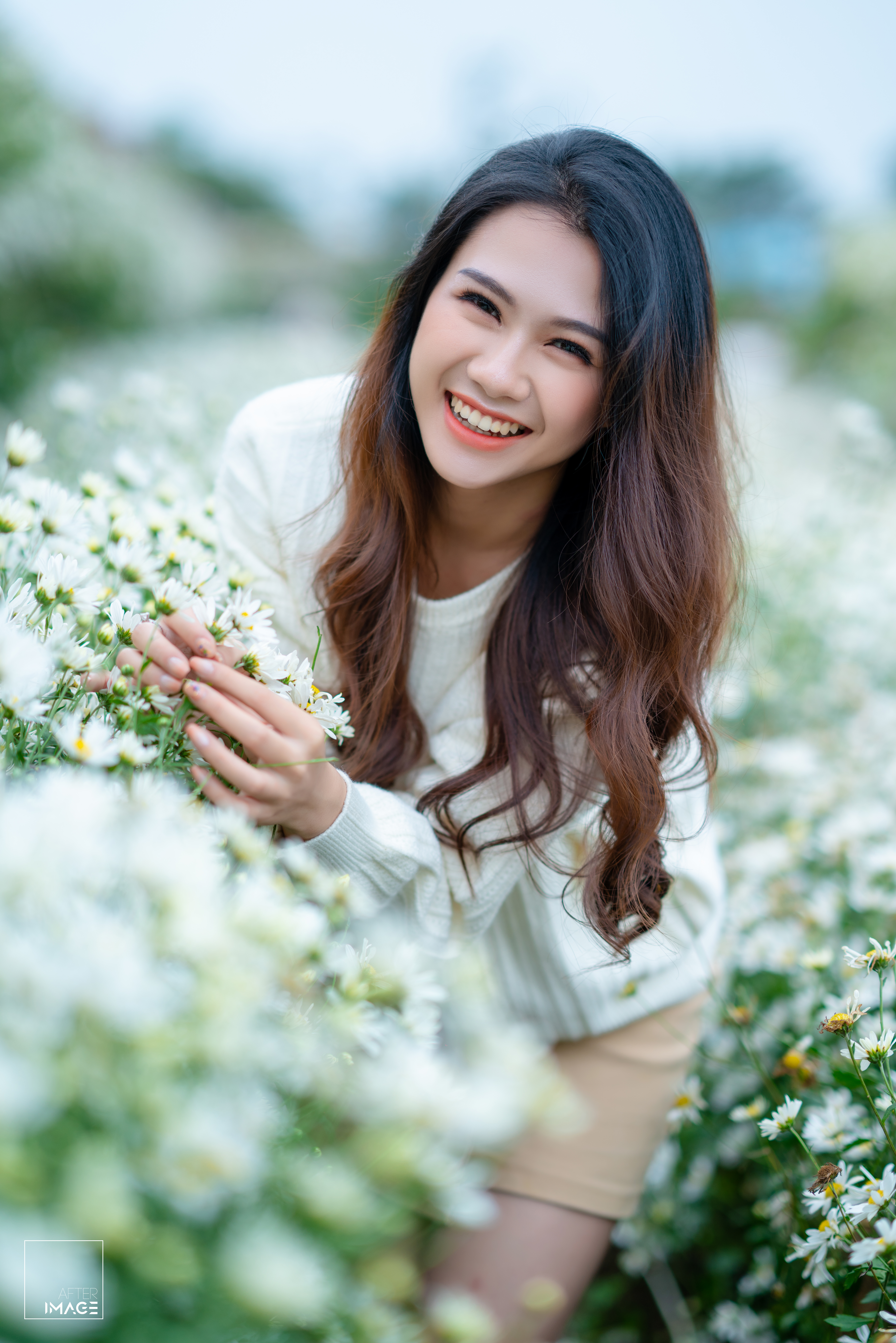 Á khôi 1 ĐH FPT, Nguyễn Thị Thơ mang nét đẹp nhẹ nhàng, nụ cười toả nắng bên cạnh cúc hoạ mi thuần khiết, dịu dàng tạo nên tổng thể hài hoà, tinh khôi.