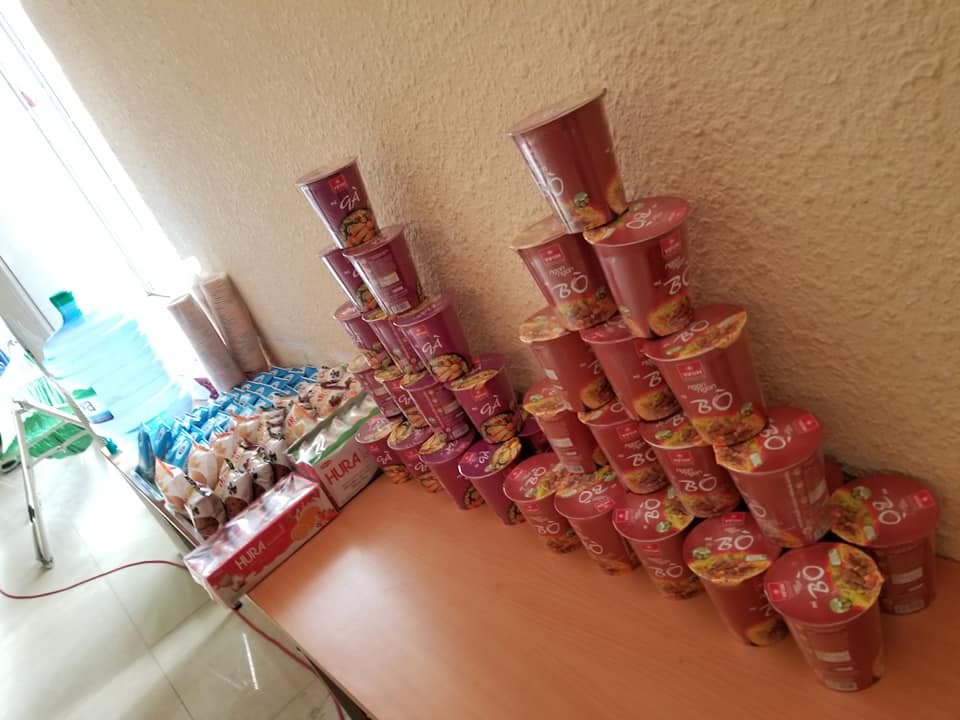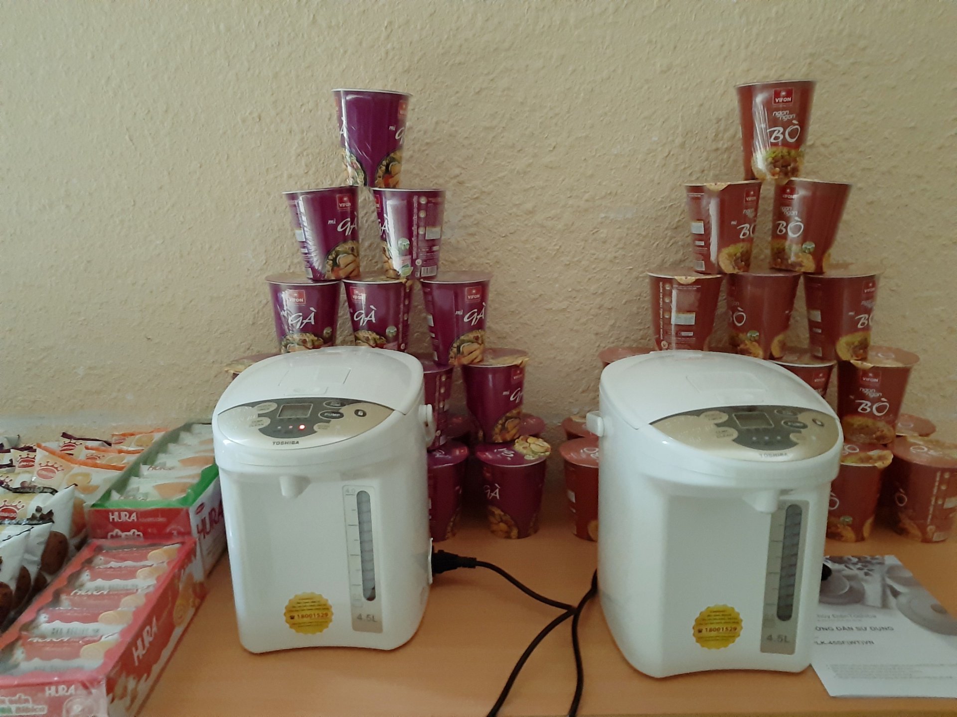 Nhà trường chuẩn bị sẵn máy đun nước nóng để các sinh viên pha mỳ “chống đói”.