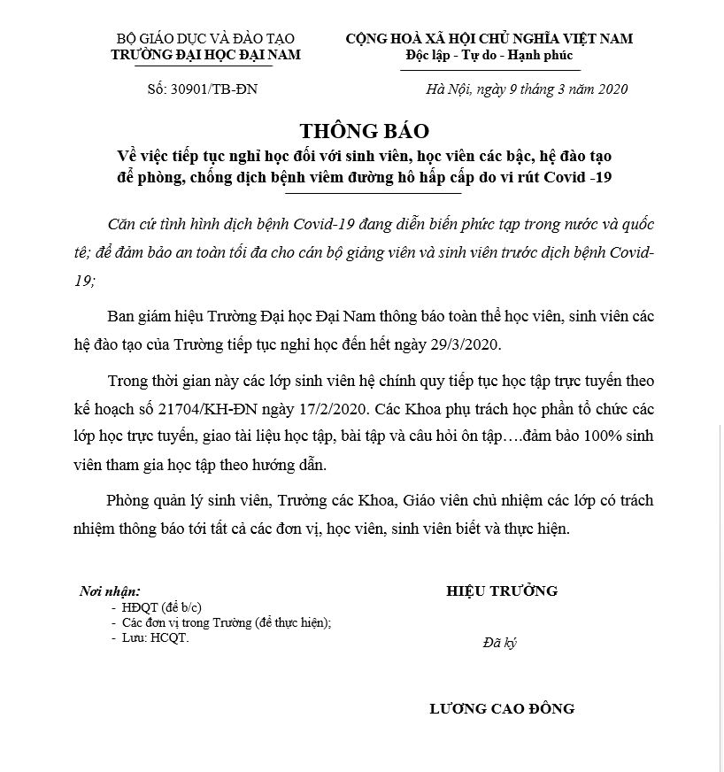 Thông báo của Đại học Đại Nam cho Sinh viên nghỉ hết tháng 3/2020.