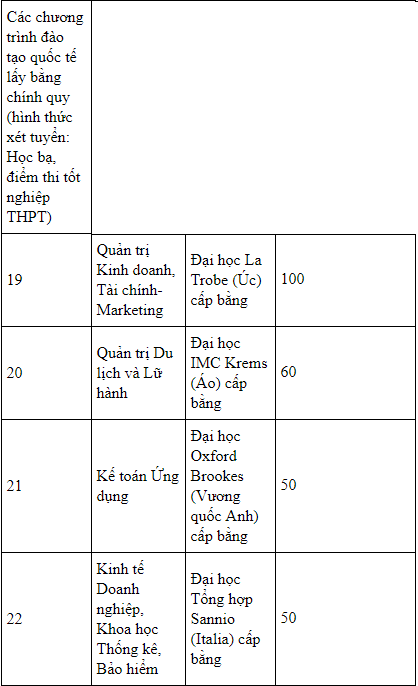 Năm 2018, nhà trường cũng tuyển sinh 260 chỉ tiêu cho các chương trình liên kết đào tạo chính quy do 4 trường đại học nước ngoài của Australia, Vương quốc Anh, Cộng hòa Áo và Cộng hòa Italia cấp bằng đối với các ngành: Quản trị Kinh doanh, Tài chính - Marketing, Quản trị Dịch vụ Du lịch và Lữ hành, Kế toán Ứng dụng, Kinh tế Doanh nghiệp, Khoa học Thống kê và Bảo hiểm.