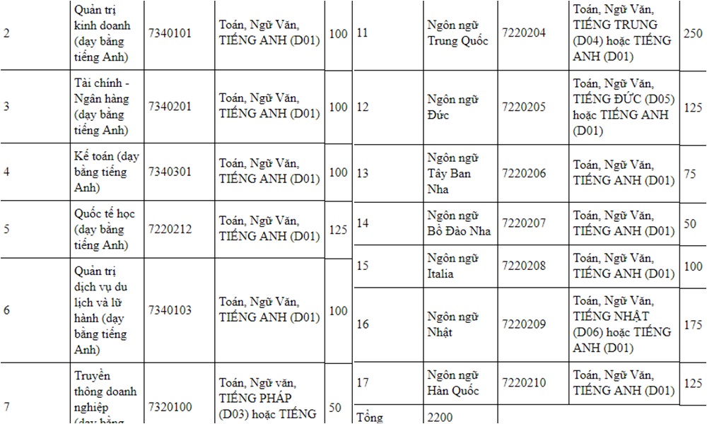 100 chỉ tiêu tăng mới phân bổ cho 03 ngành đào tạo: ngành Công nghệ Thông tin (học bằng tiếng Anh) tuyển 200 sinh viên, tăng 50 chỉ tiêu; ngành Quản trị Dịch vụ Du lịch và Lữ hành (học bằng tiếng Anh) tuyển 100 sinh viên, tăng 25 chỉ tiêu và ngành Ngôn ngữ Nga tuyển 125 sinh viên, tăng 25 chỉ tiêu.