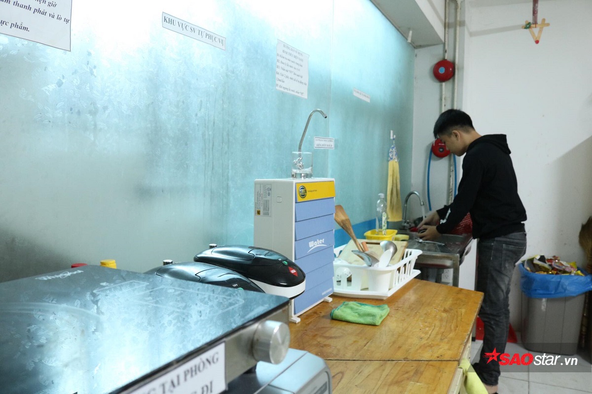 Góc sẻ chia trang bị đầy đủ máy nước nóng, chén bát, bồn rửa…