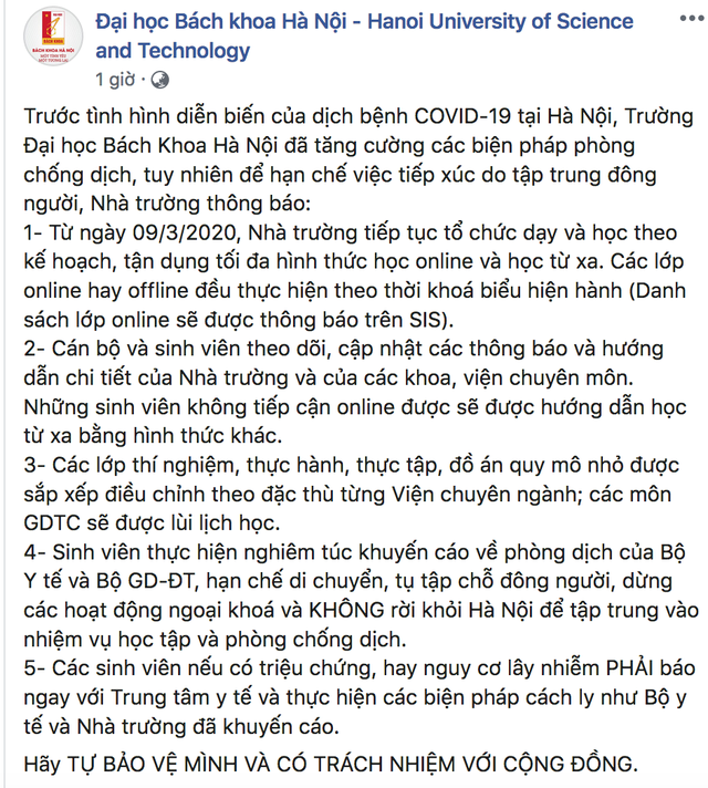 Từ ngày 09/3/2020, trường ĐH Bách Khoa Hà Nội tiếp tục tổ chức dạy và học theo kế hoạch, tận dụng tối đa hình thức học online và học từ xa. Những lớp khác và lớp đặc thù không thể chuyển sang online được (thí nghiệm, thực hành…) sẽ học chậm một tuần và có kế hoạch học bù.