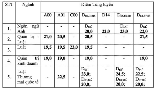 Trước đó, trường công bố kết quả kiểm tra đánh giá năng lực, điểm xét tuyển chính thức theo đề án tuyển sinh riêng. Điểm chuẩn cao nhất thuộc về ngành Luật Thương mại quốc tế với 24,5; thấp nhất là Quản trị kinh doanh với 19.