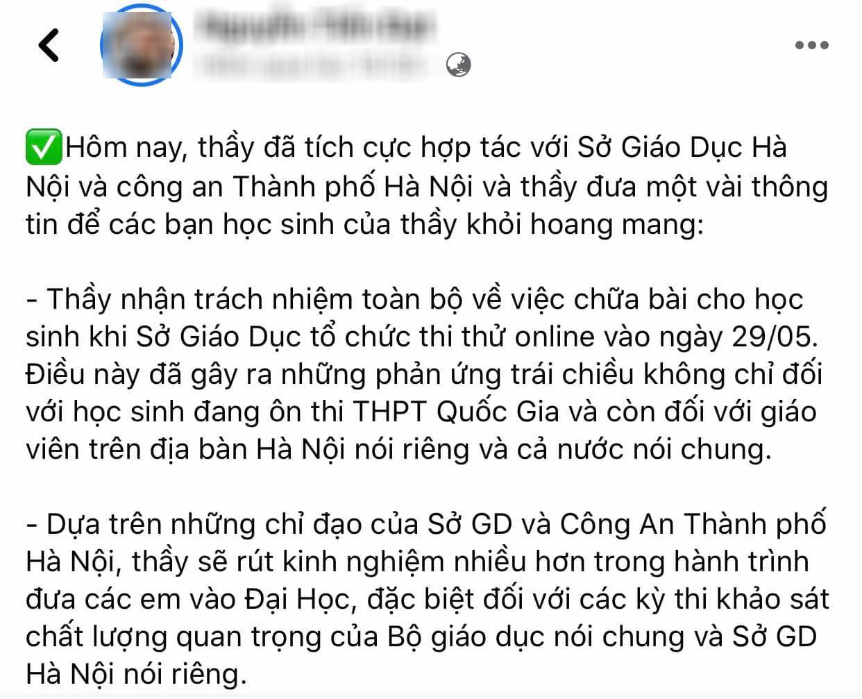 Theo đó, thầy N.T.Đ nhận trách nhiệm toàn bộ về việc chữa bài cho học sinh khi Sở Giáo Dục & Đào tạo Hà Nội tổ chức thi thử online vào ngày 29/05. Điều này đã gây ra những phản ứng trái chiều không chỉ đối với học sinh đang ôn thi THPT Quốc Gia và còn đối với giáo viên trên địa bàn Hà Nội nói riêng và cả nước nói chung.
