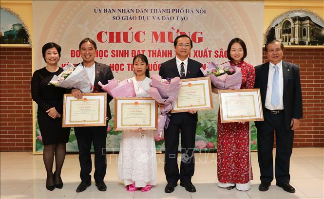 Tặng giấy khen của Giám đốc Sở Giáo dục và Đào tạo Hà Nội cho học sinh đạt thành tích trong kỳ thi Olympic Khoa học trẻ quốc tế IJSO năm 2019. Ảnh: Thanh Tùng/TTXVN