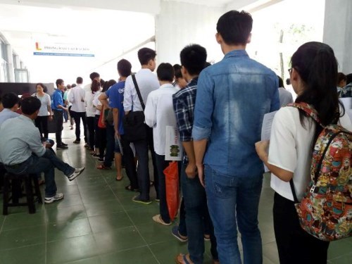 Thí sinh xếp hàng để nộp hồ sơ xét tuyển vào Đại học Bách khoa Hà Nội. (Ảnh: Phạm Mai/Vietnam+).