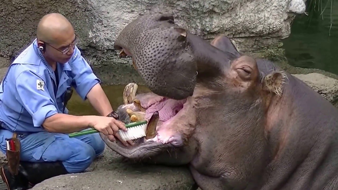 Tại vườn thú Tennoji ở Osaka, Nhật Bản, vệ sinh răng cho hà mã là việc rất quan trọng. Nhờ tập luyện, hà mã ở đây khi được gọi sẽ chủ động há to miệng để được vệ sinh răng.