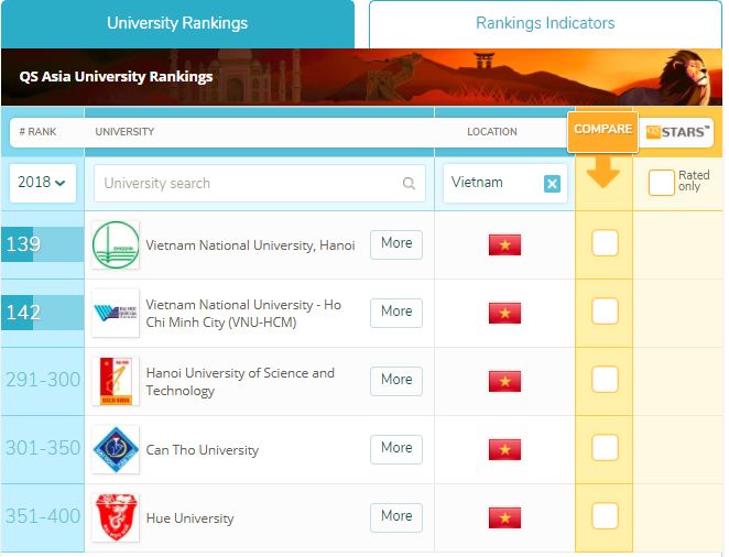 Theo bảng xếp hạng trường Đại học của QS, một trong những bảng xếp hạng có uy tín nhất thế giới của Anh, 4 đại diện đến từ Việt Nam là Đại học Quốc gia Hà Nội, Đại học Quốc gia TP.HCM, Đại học Bách Khoa Hà Nộ và Đại học Cần Thơ.