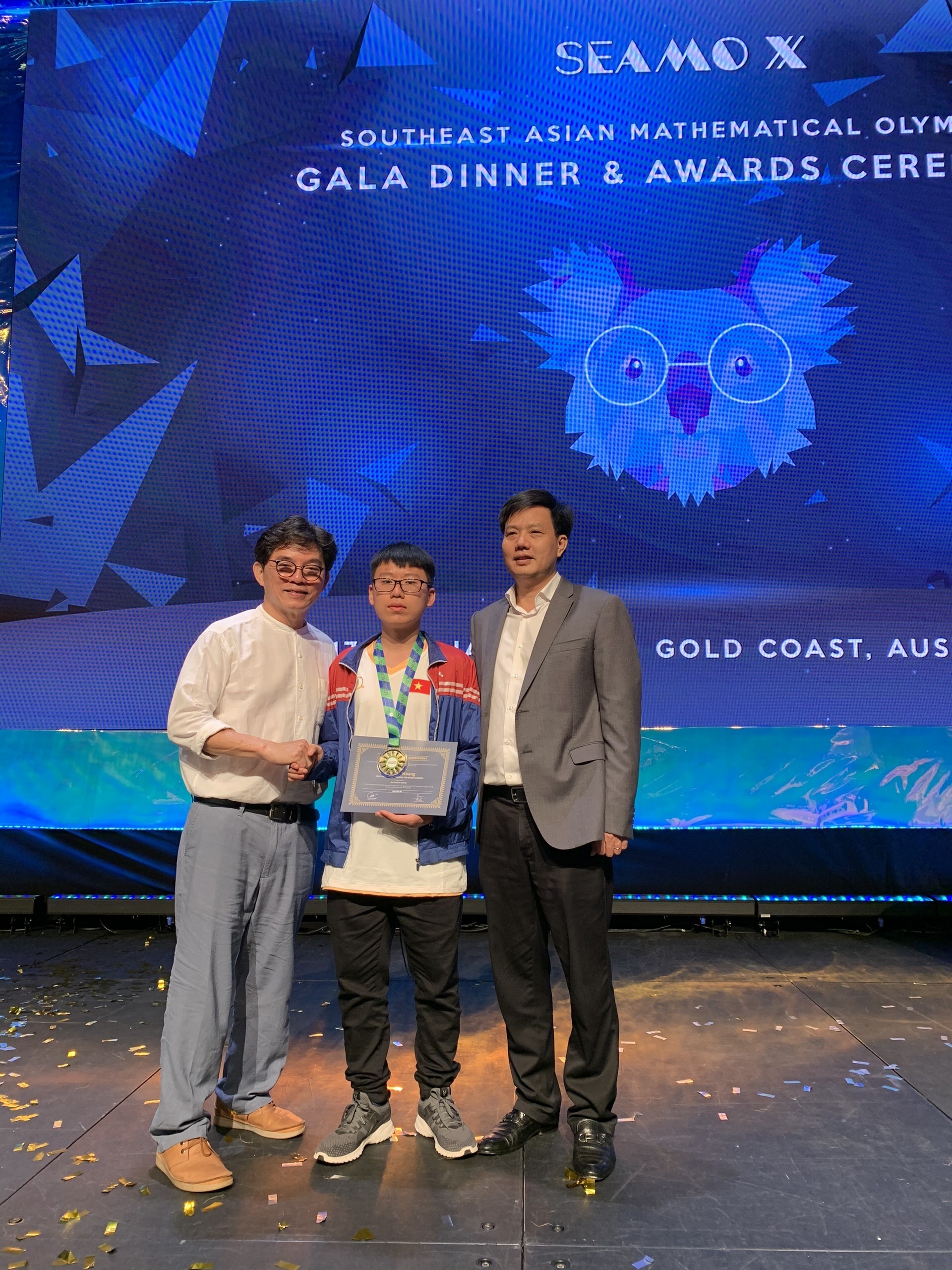 Thí sinh Lê Xuân Hoàng (giữa) cùng giáo sư Terry Chew - nhà sáng lập kỳ thi SEAMO (trái) và Tiến sĩ Nguyễn Hoàng Giang - Viện trưởng Viện nghiên cứu Khoa học Giáo dục Sáng tạo RICE (phải)