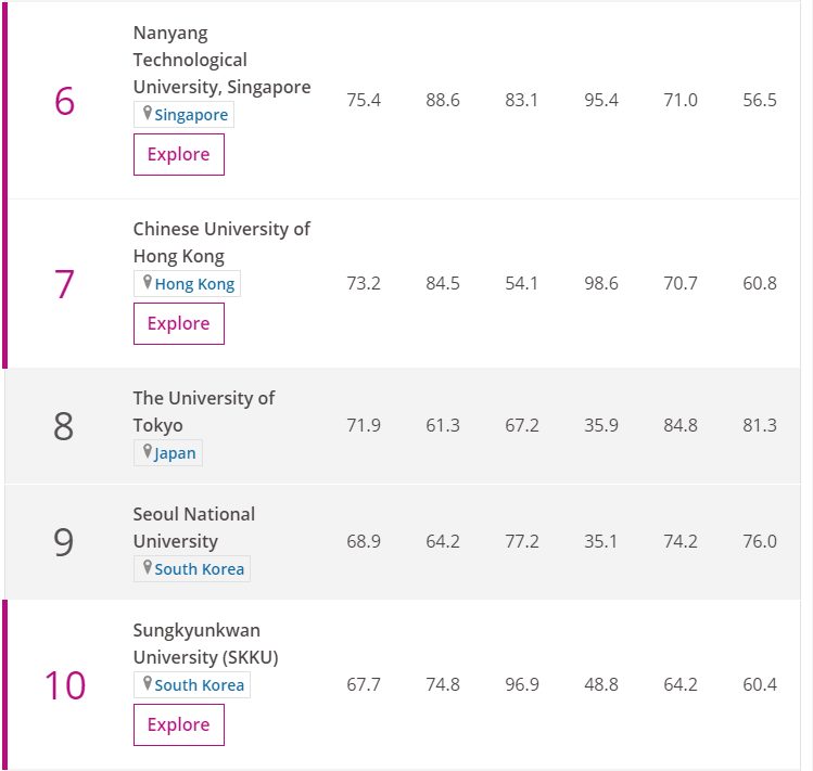 Singapore là quốc gia nổi bật ở Đông Nam Á khi có 2 trường lọt vào top 10 là Đại học quốc gia Singapore (xếp thứ 2) và Đại học Công nghệ Nanyang (xếp thứ 6)