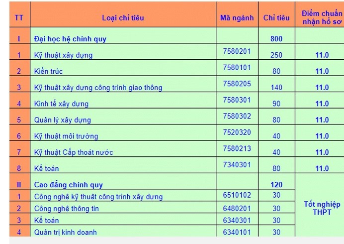 Điểm nhận hồ sơ xét tuyển của Đại học Xây dựng miền Trung.