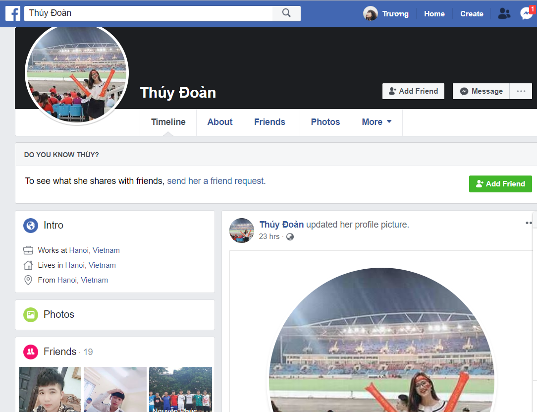 Tài khoản mạo danh Thúy Đoàn với số lượng friends vỏn vẹn 19.