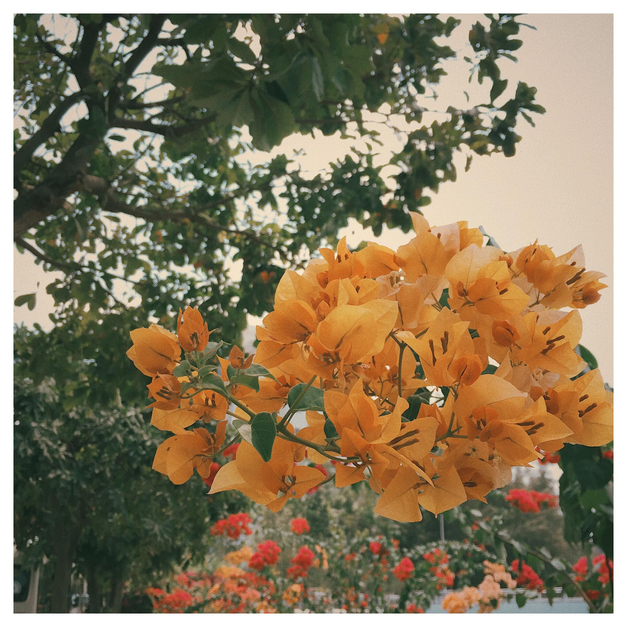 Phía trước dàn hoa giấy là những tòa nhà cao tầng.
