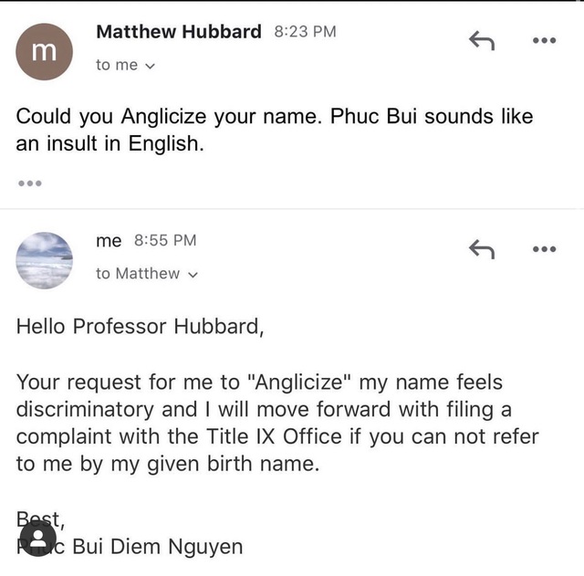 Cụ thể, trong các thư điện tử ghi lại cuộc trao đổi giữa ông Hubbard và sinh viên Phuc Bui Diem Nguyen, giáo sư này đã yêu cầu sinh viên này phải đổi tên vì ông cho rằng cụm từ “Phuc Bui” nghe như “từ có ý nghĩa xúc phạm” trong tiếng Anh.