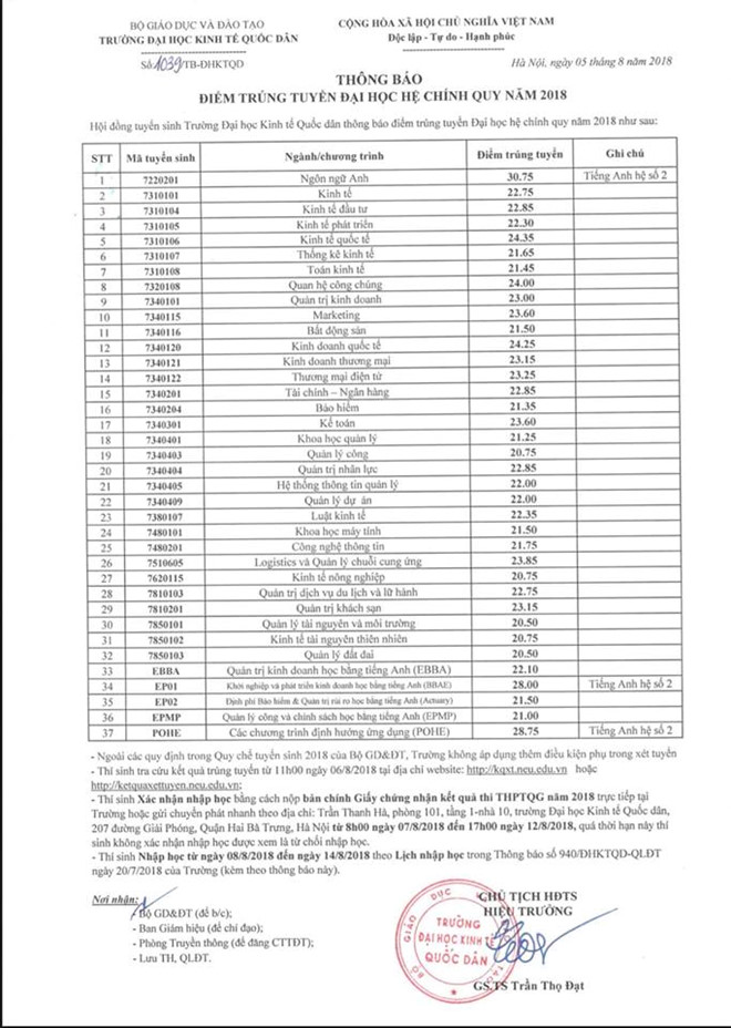 Điểm chuẩn 2018 của ĐH Kinh tế Quốc dân.