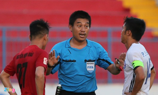 Sai sót của trọng tài Nguyễn Hiền Triết (giữa) ở vòng 2 “mở hàng” cho hàng loạt sai lầm liên tiếp trong công tác trọng tài điều hành mùa giải 2017. Ảnh: Tùng Lê.