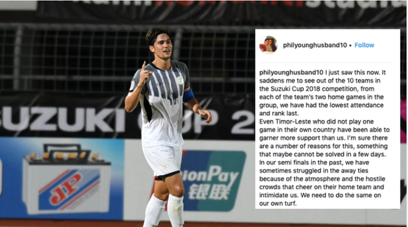 Ngay cả một đội bóng không có sân nhà ở AFF Cup 2018 là Đông Timor cũng có nhiều CĐV đến sân cổ vũ hơn chúng ta. Sự động viên của các bạn vô cùng quan trọng. Xin mọi người đến sân cổ vũ chúng tôi, bảo nhau lấp đầy sân ở trận chiến với Việt Nam sắp tới”, Phil Younghusband viết trên mạng xã hội.