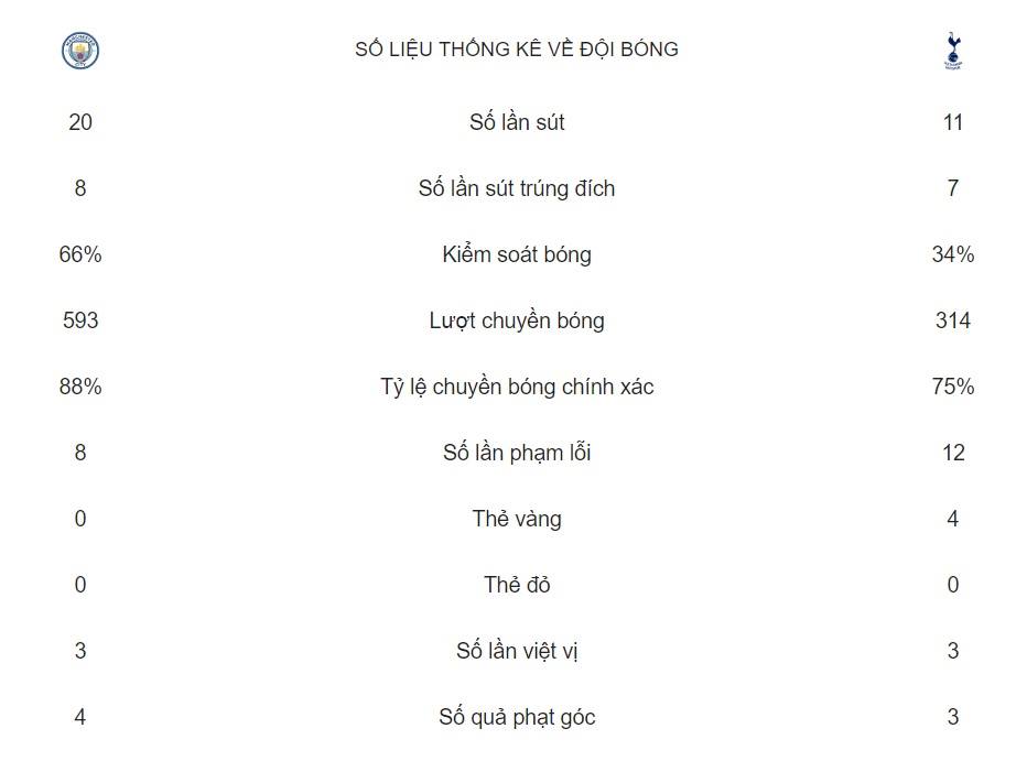 Thống kê trận tứ kết C1: Tottenham vs Man City