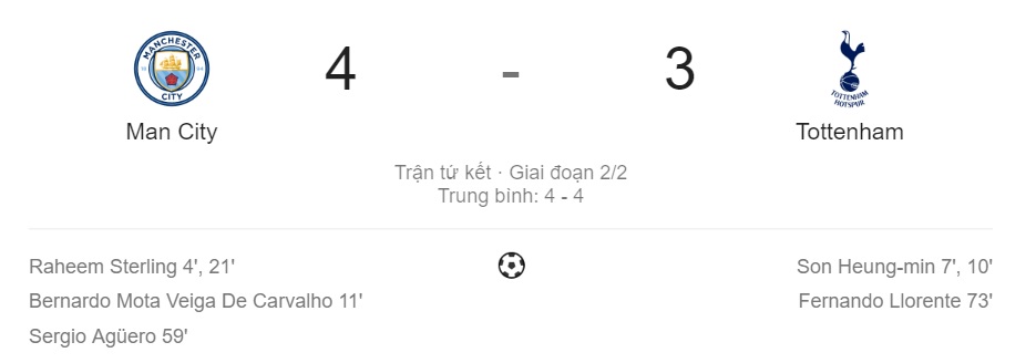 Phút thứ 93, khi tỷ số đang là 4-3, Sterling ghi bàn sau đường chuyền của Aguero. Bàn thắng này sẽ giúp Man City vượt qua Tottenham để có mặt ở bán kết với tổng tỷ số 5-4.