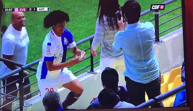 Trong trận đấu giữa Everton và Antofagasta của giải VĐQG Chile diễn ra vào hôm qua đã xảy ra một tình huống thú vị và hài hước. Tiền đạo Eduard Bello của Antofagasta sau khi ghi bàn ở ngay phút thứ 2 đã chạy một mạch lên khán đài để cầu hôn bạn gái.