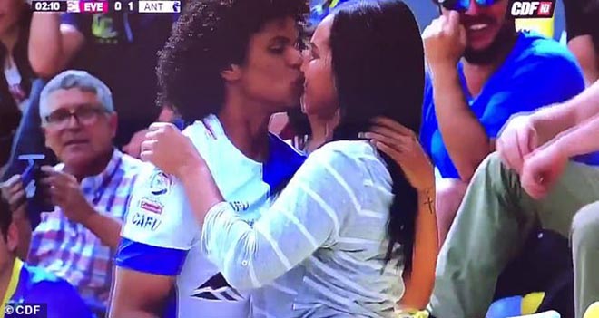 Tiền đạo này đã bày tỏ tình cảm mãnh liệt của mình bằng cách ôm, hôn và trao nhẫn cầu hôn cho cô bạn gái xinh đẹp. Cặp đôi đã nhận được sự tán thưởng của tất cả các CĐV có mặt trên khán đài.