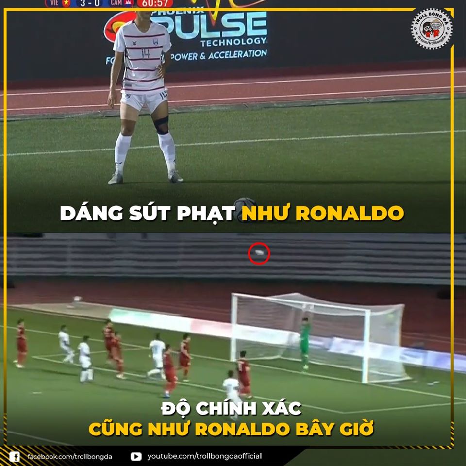 Cầu thủ số 14 của Campcuchia bị cộng đồng mạng Việt Nam troll không trượt phát nào với tư thế đá phạt giống CR7. (Ảnh của troll bóng đá)