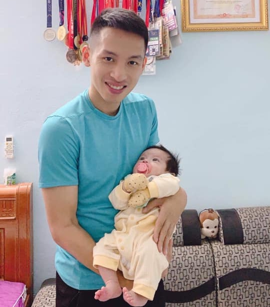 Lần đầu tiên được làm bố, Bùi Tiến Dũng tỏ ra rất hạnh phúc. Mỗi khi được nghỉ xả hơi, không phải tập luyện, thi đấu thay vì lựa chọn các thú vui khác để xua tan căng thẳng, anh lại tranh thủ về bên gia đình, chăm sóc vợ con. (Ảnh FBNV)