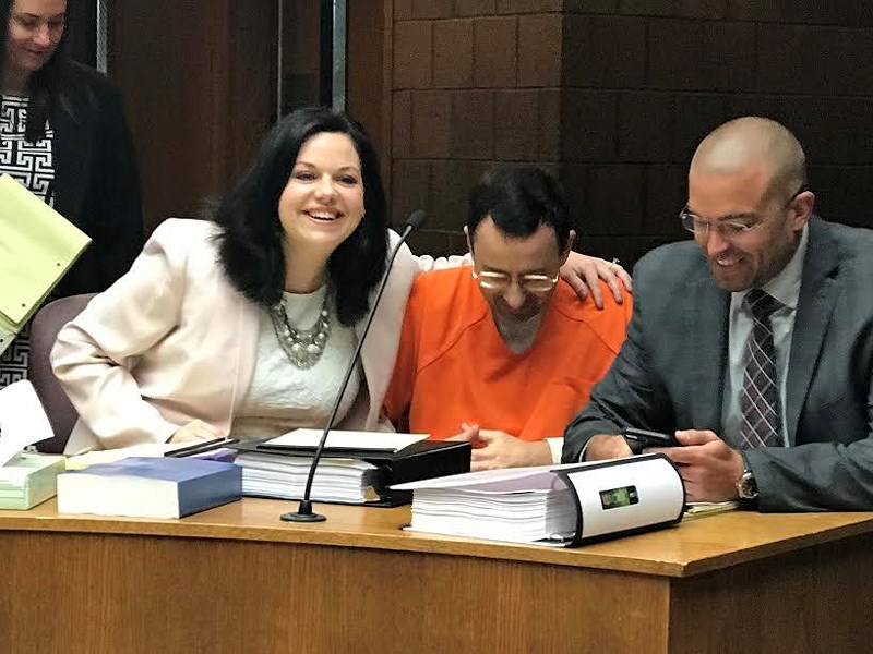BS Larry Nasser (giữa) cùng các luật sư của mình.