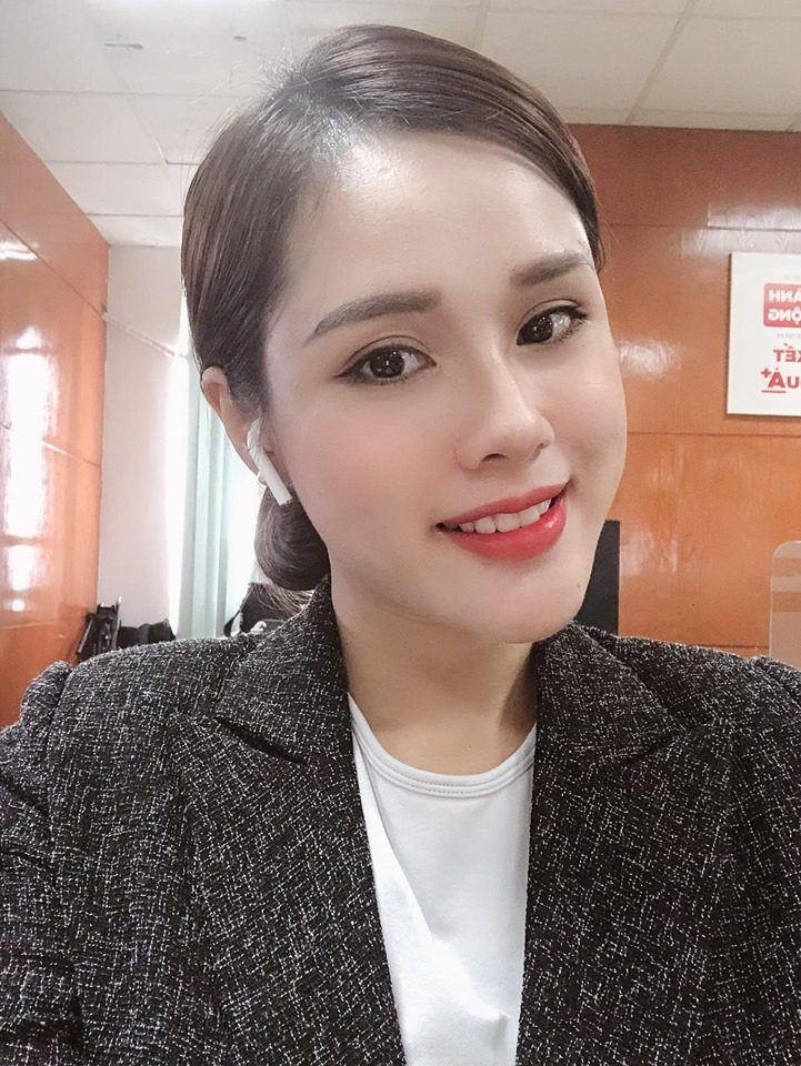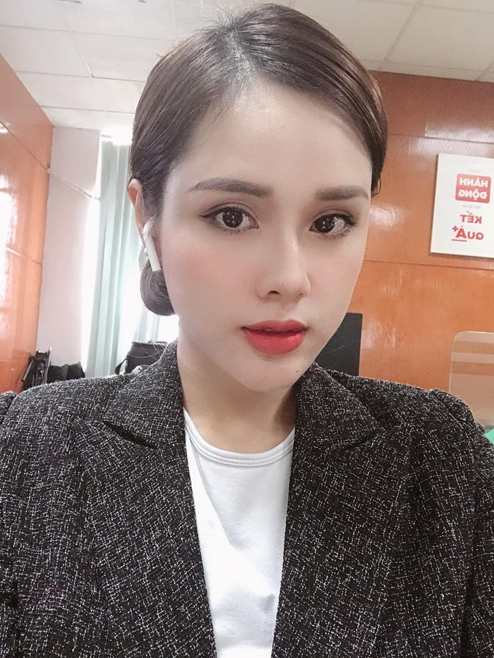 Vận bộ đồ công sở khá nghiêm túc, Huyền Trang vẫn giữ được nét xinh đẹp.