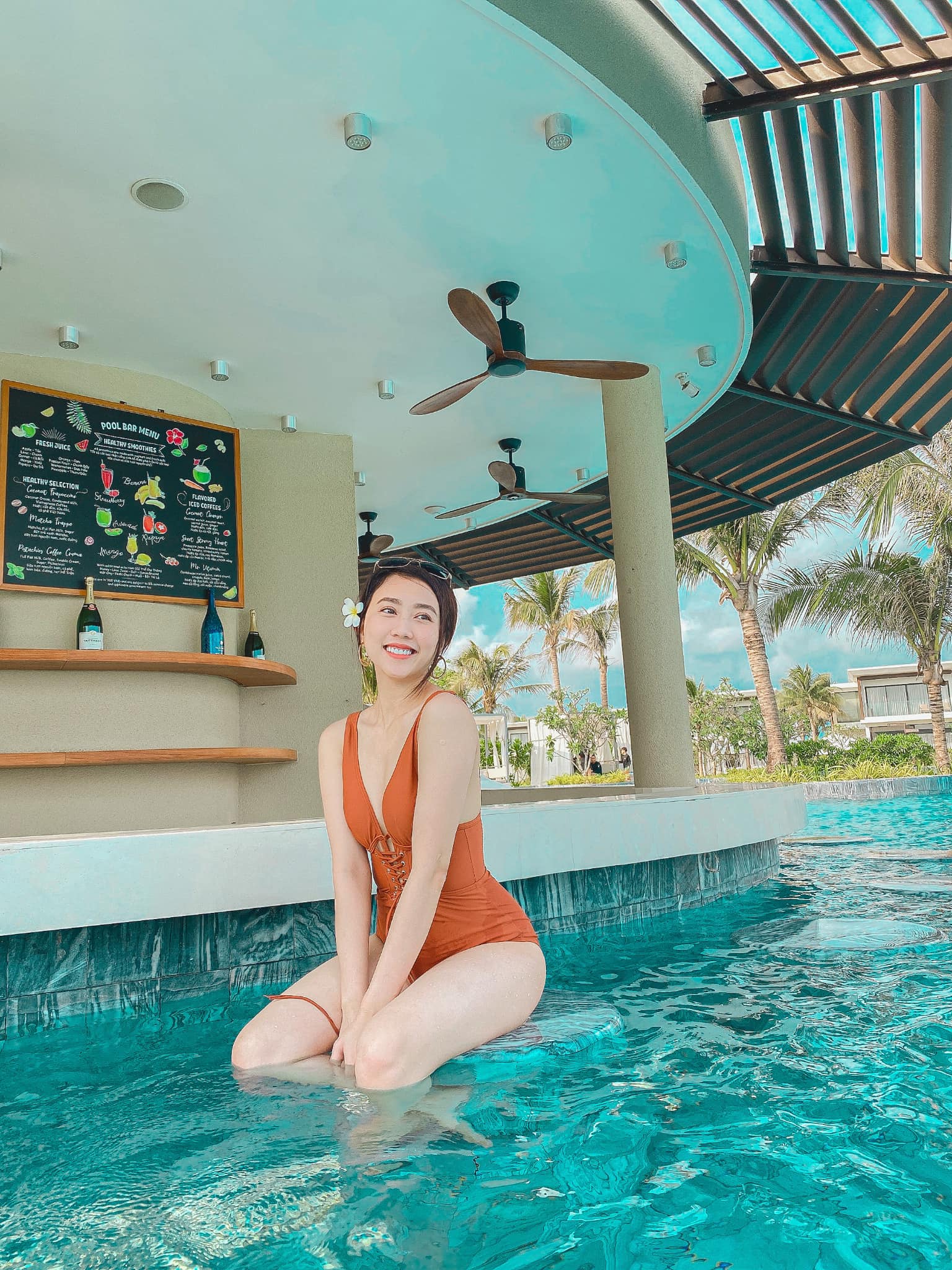 Mới đây, Huỳnh Hồng Loan đăng hình ảnh thư giãn bên bể bơi trong bộ bikini màu cam sau những ngày thực hiện cách ly khỏi xã hội.