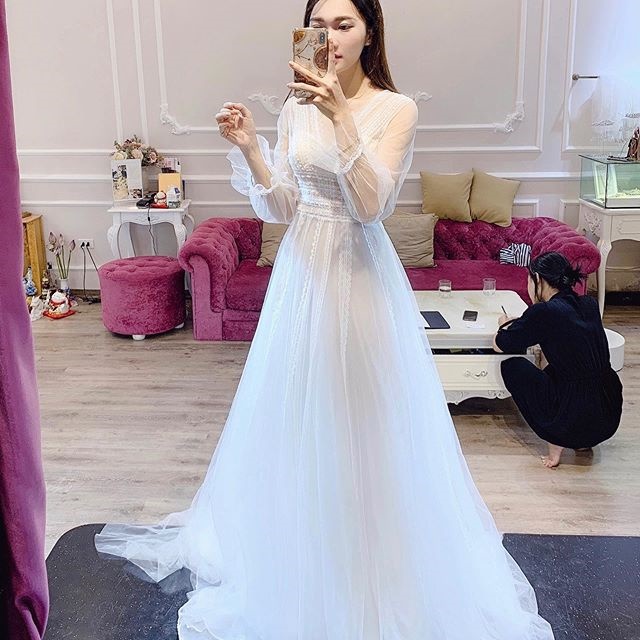Chưa hết, mới đây Ngọc Nữ đăng tải một bức ảnh chụp lại khoảnh khắc thử váy cưới trước gương kèm caption ngọt như mía lùi: “Váy trắng có đủ làm anh say nắng”.