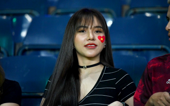 Gương mặt xinh xuất sắc cùng gu ăn mặc sành điệu của bạn gái Hoàng Đức lập tức chinh phục được các fan khó tính của Thái Lan. Ai nấy cũng xuýt xoa rằng con gái Việt ngày càng xinh đẹp, quyến rũ. Một số CĐV xứ chùa Vàng còn gọi “nàng thơ” Hoàng Đức là vợ. (Ảnh của Fathailand)