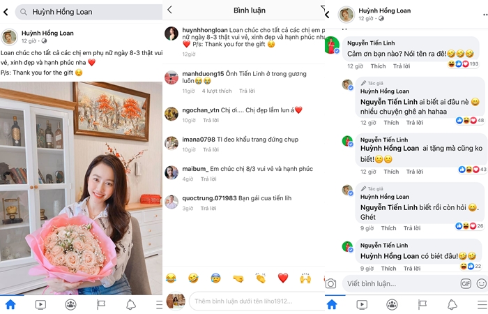 Trong ngày 8/3, trên trang cá nhân của những nàng Wags thi nhau đăng những món quà được tặng, đặc biệt là từ các chàng cầu thủ. Bạn gái Nguyễn Tiến Linh đăng hình đẹp rạng rỡ chụp cùng bó hoa hồng với dòng caption: “Loan Chúc cho tất cả các chị em phụ nữ ngày 8-3 thật vui vẻ, xinh đẹp và hạnh phúc nha. P/s: Thank you for the gift”.