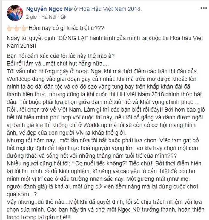 Chia sẽ trên trang cá nhân lý do khiến Nguyễn Ngọc Nữ quyết định dừng cuộc thi Hoa hậu Việt Nam 2018 là vì: “Thời gian này lịch trình công việc của Ngọc Nữ có nhiều thay đổi, phụ thuộc vào đối tác. Tôi không thể thu xếp trọn vẹn gần 3 tháng để tham gia cuộc thi Hoa hậu Việt Nam 2018 theo lịch trình của BTC”.