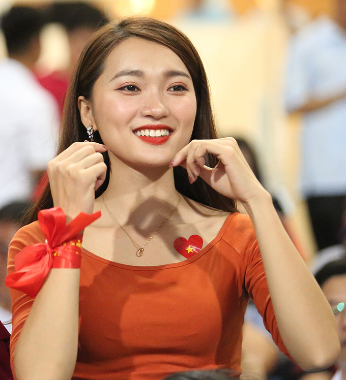 Hình ảnh cô nàng Hoa hậu cổ vũ cực sung trên khán đài Mỹ Đình trong trận đấu với Malaysia.