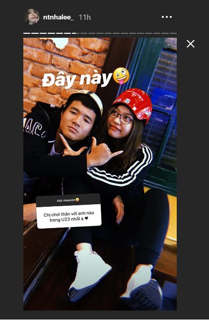 Đứng giữa tâm bão chỉ trích, bất ngờ thay, bạn gái Quang Hải - hot girl Nhật Lê lại lên tiếng an ủi theo một cách “đặc biệt”. Cụ thể trong thử thách “Ask me” của instagram, khi được hỏi ai là cầu thủ mà Nhật Lê thân nhất trong U23 Việt Nam, cô nàng không ngần ngại tiết lộ đó là Hà Đức Chinh cùng một bức ảnh vô cùng thân mật, ngộ nghĩnh của cả hai.