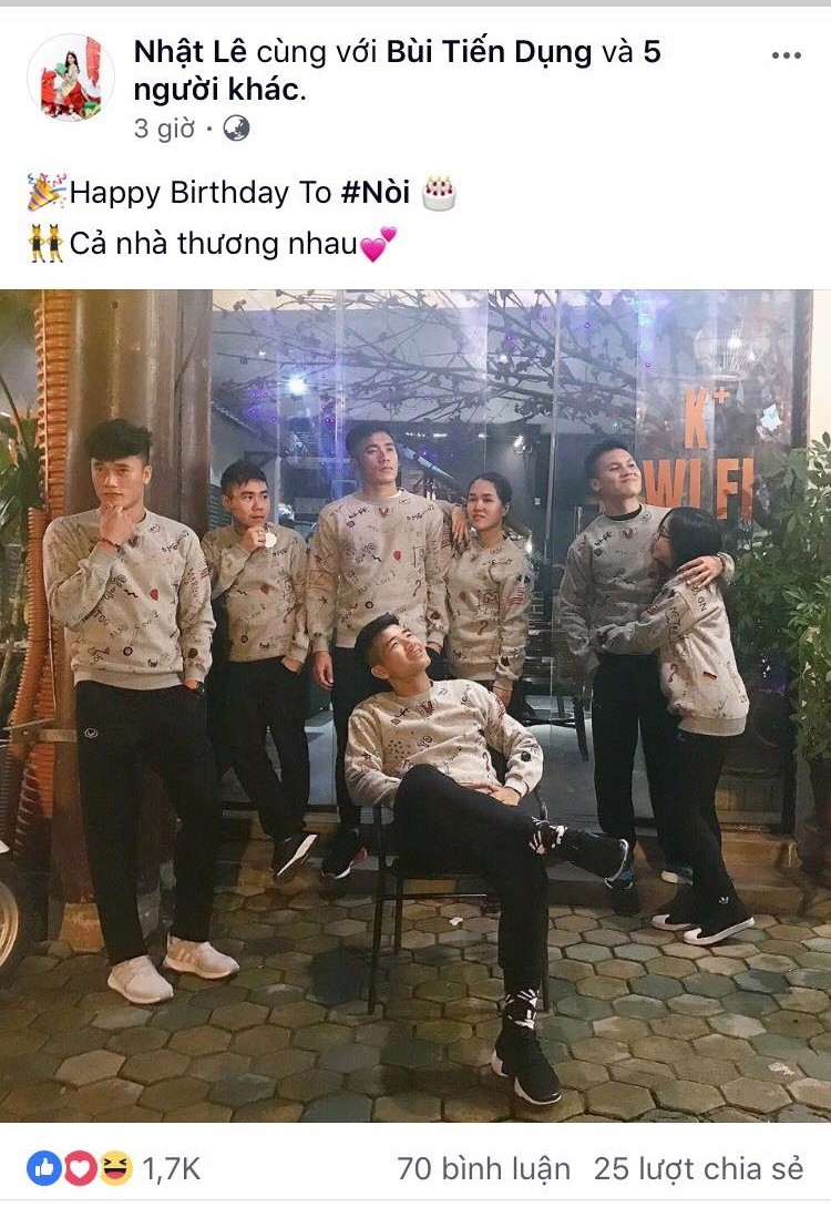 Nhật Lê - người yêu của tiền vệ Quang Hải đã đăng tải tấm hình chúc mừng kèm theo dòng trạng thái: “Cả nhà thương nhau”. Tấm hình lập tức được rất nhiều người like và share.